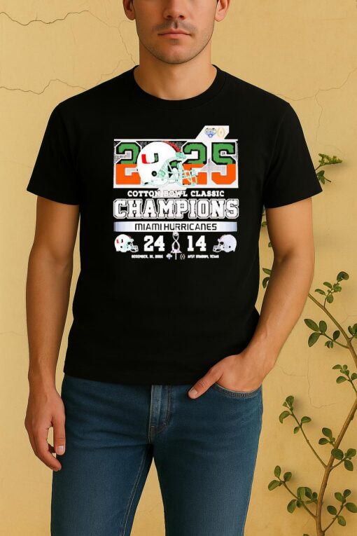 Officials Miami Hurricanes 2025 Cotton Bowl Champions Helmet Score Shirt